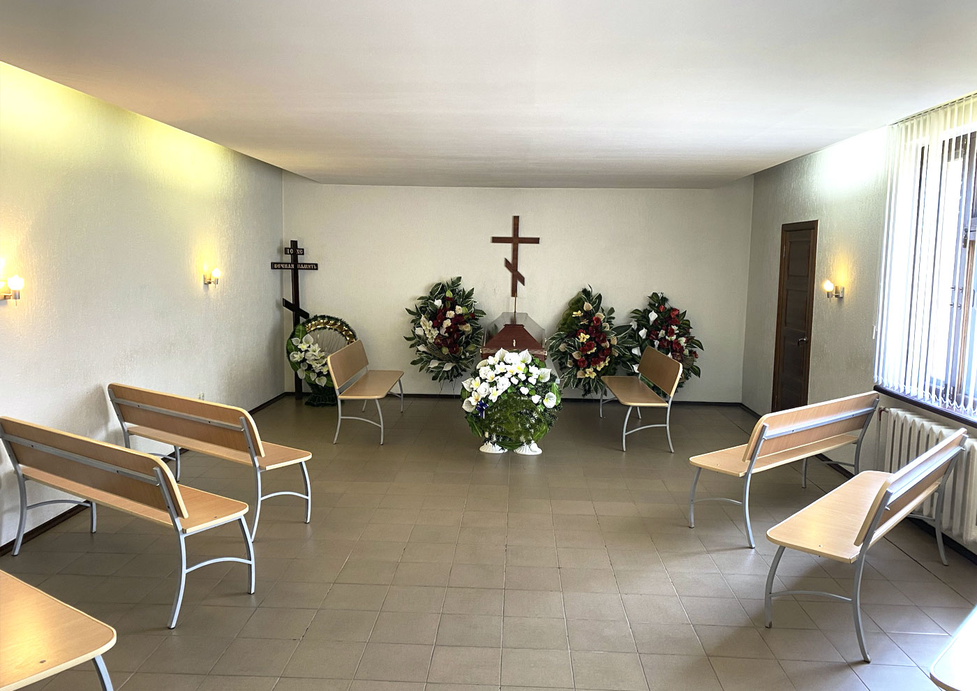 Большой ритуальный зал в Новинках площадью 85 кв. м подходит для гражданских и религиозных церемоний прощания. Помещение оснащено постаментом для гроба, местами для родственников и системой вентиляции, что создает комфортную атмосферу для проведения обрядов.